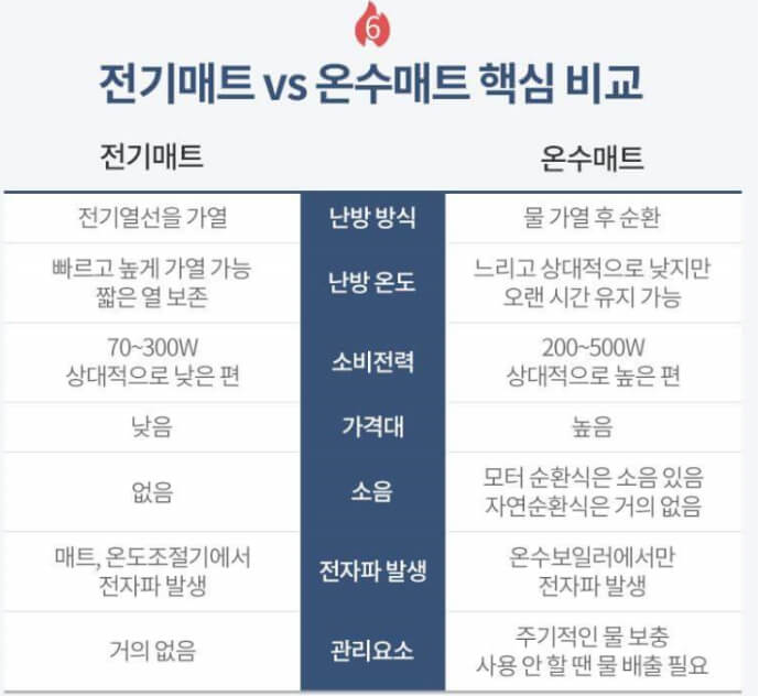 | 특징 | 전기매트 | 온수매트 |