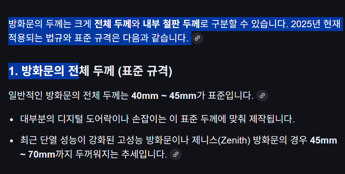 - 보통 게이트맨, 직방, 삼성, 마스터즈 같은 상급 브랜드의 기본 적용 두께가 35~45mm 정도인 경우가 많습니다.